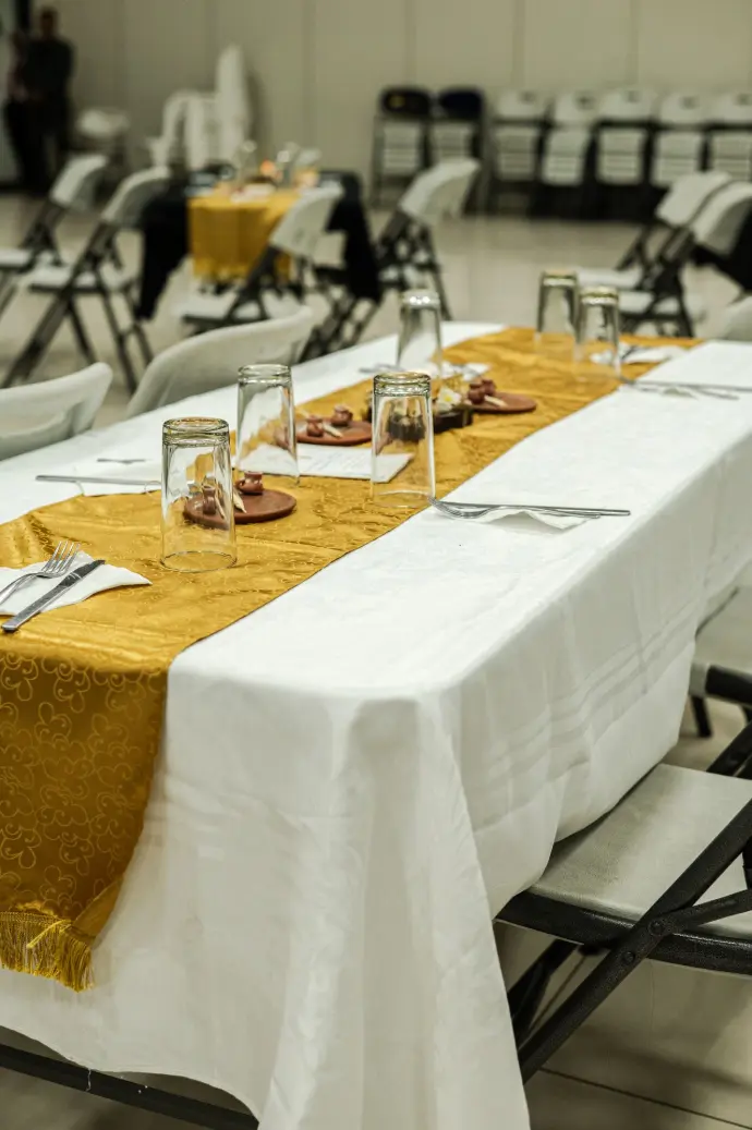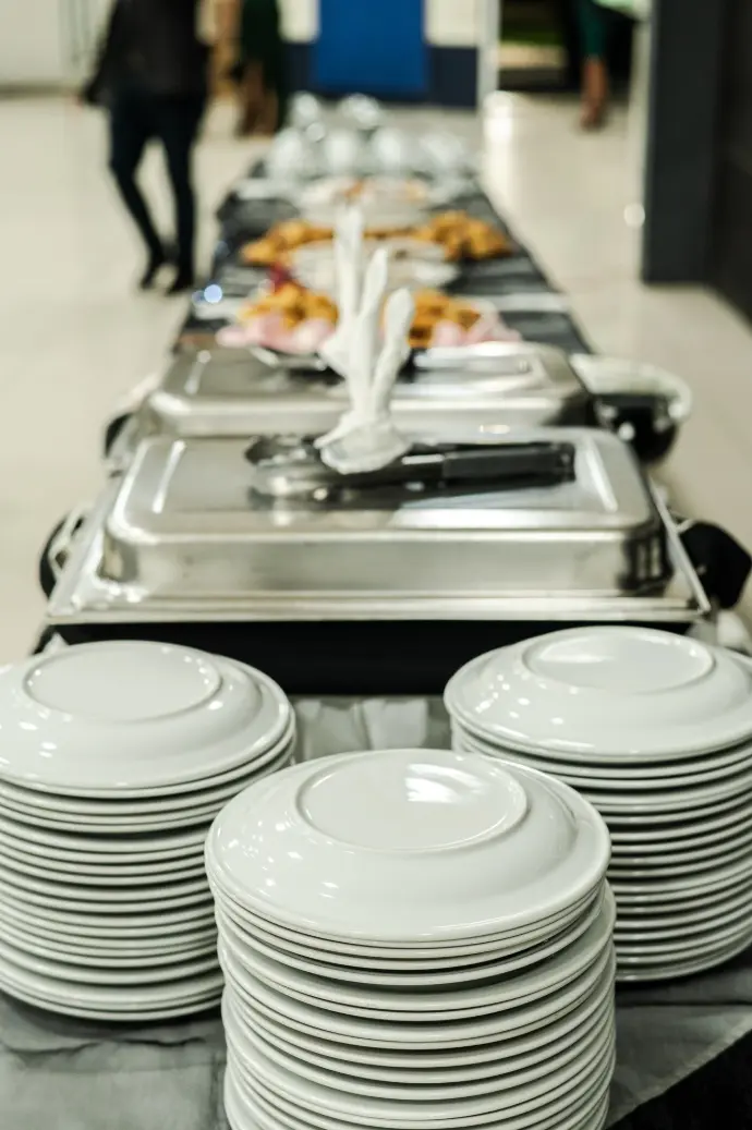 Servicio tipo buffet con un montaje elegante y funcional, cuidadosamente diseñado para realzar la presentación de los platillos y complementar la estética del evento.